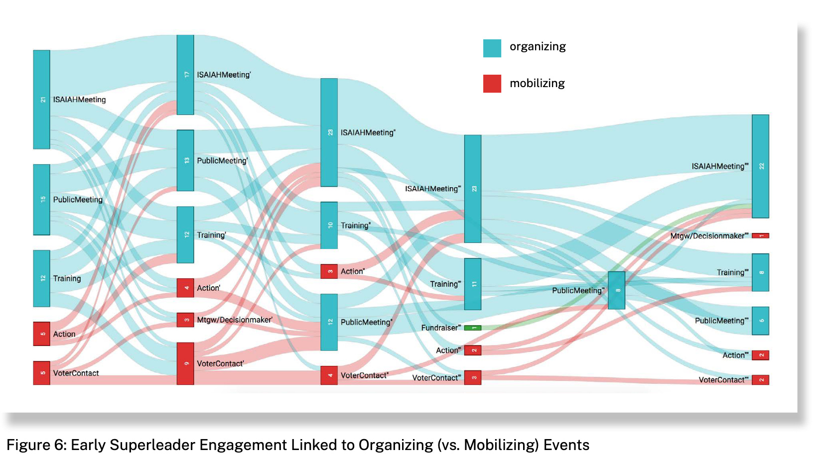 To determine which sequence of events helped onboard and retain ISAIAH superleaders, we first downloaded the event history data for all members and supporters. Next, we used ISAIAH’s own coding (“Event Type”) and our qualitative knowledge of the organization’s programs to collapse event categories into mobilizing (red) or organizing (blue) events. We looked at the first five events of ISAIAH’s “super leaders.” [These are volunteer leaders with their own followings who consciously work as member organizers.] On average these super leaders had participated in 21 events with the organization.