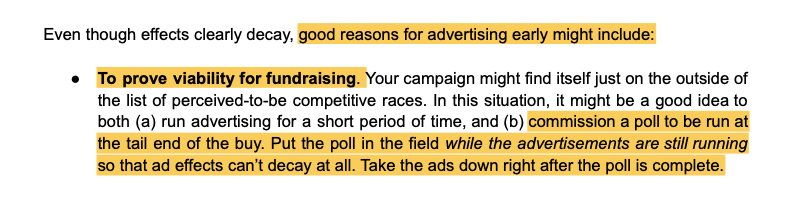 What follows is page after page of advice on how to get earned media, how to cultivate reporters, the value of building a brand or slogan, plus lots of detail on all the different venues for paid advertising (linear television, streaming, YouTube, Meta, radio, podcasts, apps, direct mail, paid canvassing, and paid influencers). The best time to run ads, Strauss writes, is in the last week before an election, but he also suggests doing so earlier if an ad will “prove viability for fundraising” or “to fundraise from voters.” If you’re doing the former, he says, “it might be a good idea to both (a) run advertising for a short period of time, and (b) commission a poll to be run at the tail end of the buy. Put the poll in the field while the advertisements are still running so that ad effects can’t decay at all. Take the ads down right after the poll is complete.”