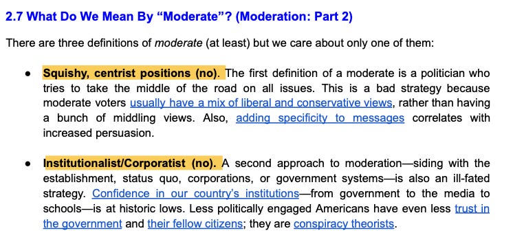 A politician who tries to take the middle road on all issues—a “squishy, centrist”—is not the kind of moderate the playbook endorses, because, Strauss writes, “moderate voters usually have a mix of liberal and conservative views.” In that case, why not recognize that such voters are confused or volatile or multidimensional instead of sticking to a one-dimensional view of people’s political leanings? Strauss also rejects the notion that being a moderate means “siding with the establishment, status quo, corporations, or government systems.” He notes that confidence in America’s institutions is at an all-time low and many less-engaged voters have even less trust and tend to be conspiracy theorists. That indeed seems to be true, but how then are these people “moderates”?