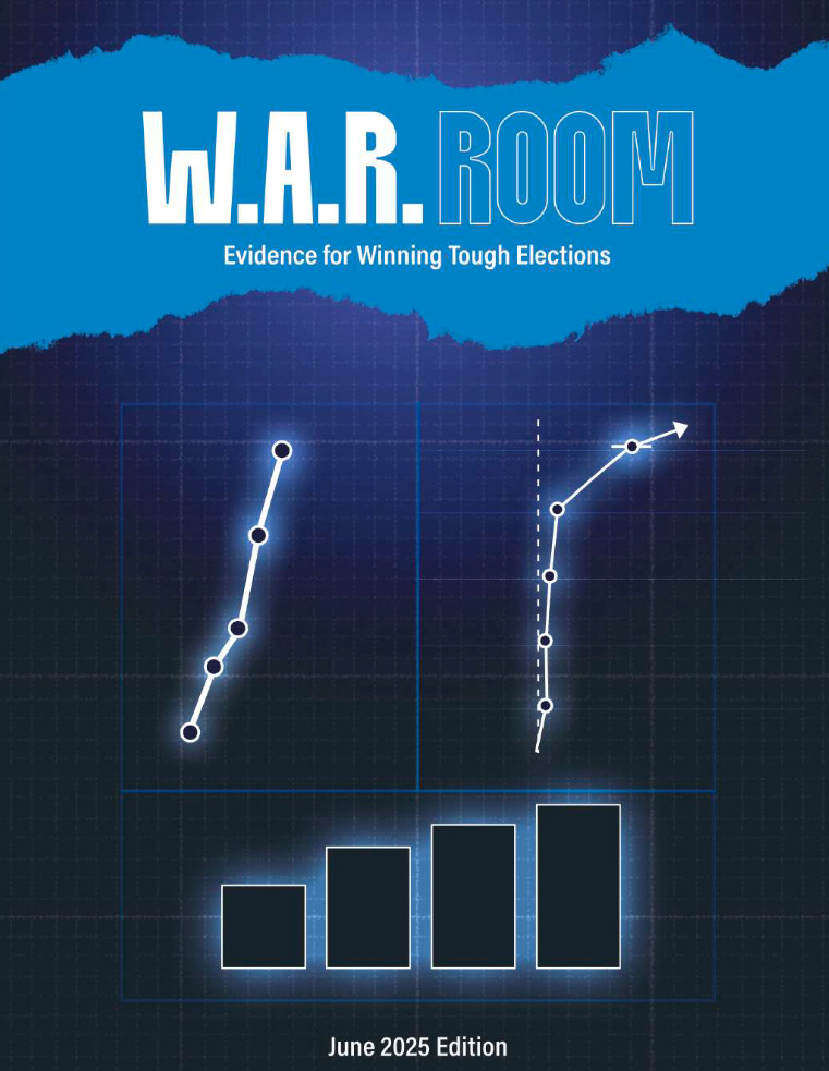 “W.A.R.” stands for “wins above replacement,” a baseball term that Strauss and his colleagues have adopted as their way of describing someone who performs above their position’s baseline, which in electoral terms means getting a vote share above expectations. The existence of something called the “W.A.R. Room” itself is not a secret – it started as a post-2024 eight-week Zoom night school for mid-career campaign and political staff held in the spring of 2025, followed by a two-day in-person gathering in Washington, DC in early June. You can read about its core curriculum and see its list of trainers at War-Room.us. What you can’t see is the W.A.R. Room book, which is made available to campaign managers free of charge. I’m only going to quote from salient sections today, because a lot of people put serious work into this thing and it comes with strenuous requests about not sharing it publicly.