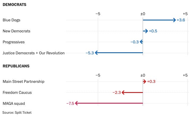 This suggests that House incumbents in the Blue Dog Caucus did better than expected in 2024 while Justice Democrats did worse. But are Blue Dogs NOT corporate Democrats or squishy centrists? Strauss doesn’t say. And are they benefiting from advantages that come from incumbency and/or not having mega-millions spent trying to damage their brand, as has been the case with “The Squad”? Strauss also doesn’t say. Bonica (with colleague Jake Grumbach) makes a more devastating critique of the Split Ticket analysis, arguing that the whole way it defines “wins above replacement” is broken. By his analysis, when you look at how Democrats performed compared to Kamala Harris in 2024, “moderates and progressives did essentially the same.”