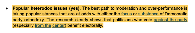 Finally, we get to the kind of moderate the playbook wants candidates to emulate: someone who takes popular AND heterodox positions. Strauss writes, “The best path to moderation and over-performance is taking popular stances that are at odds with either the focus or substance of Democratic party orthodoxy. The research clearly shows that politicians who vote against the party (especially from the center) benefit electorally.”